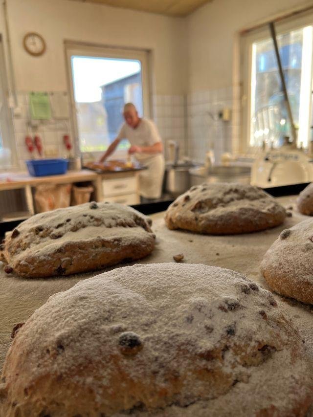 Unsere Bäcker Rainer und Daniel haben leckere Christstollen gebacken. Es gibt ihn in klein für 7,90 € (ca. 350 g) und groß für 15,90 € (750 g).