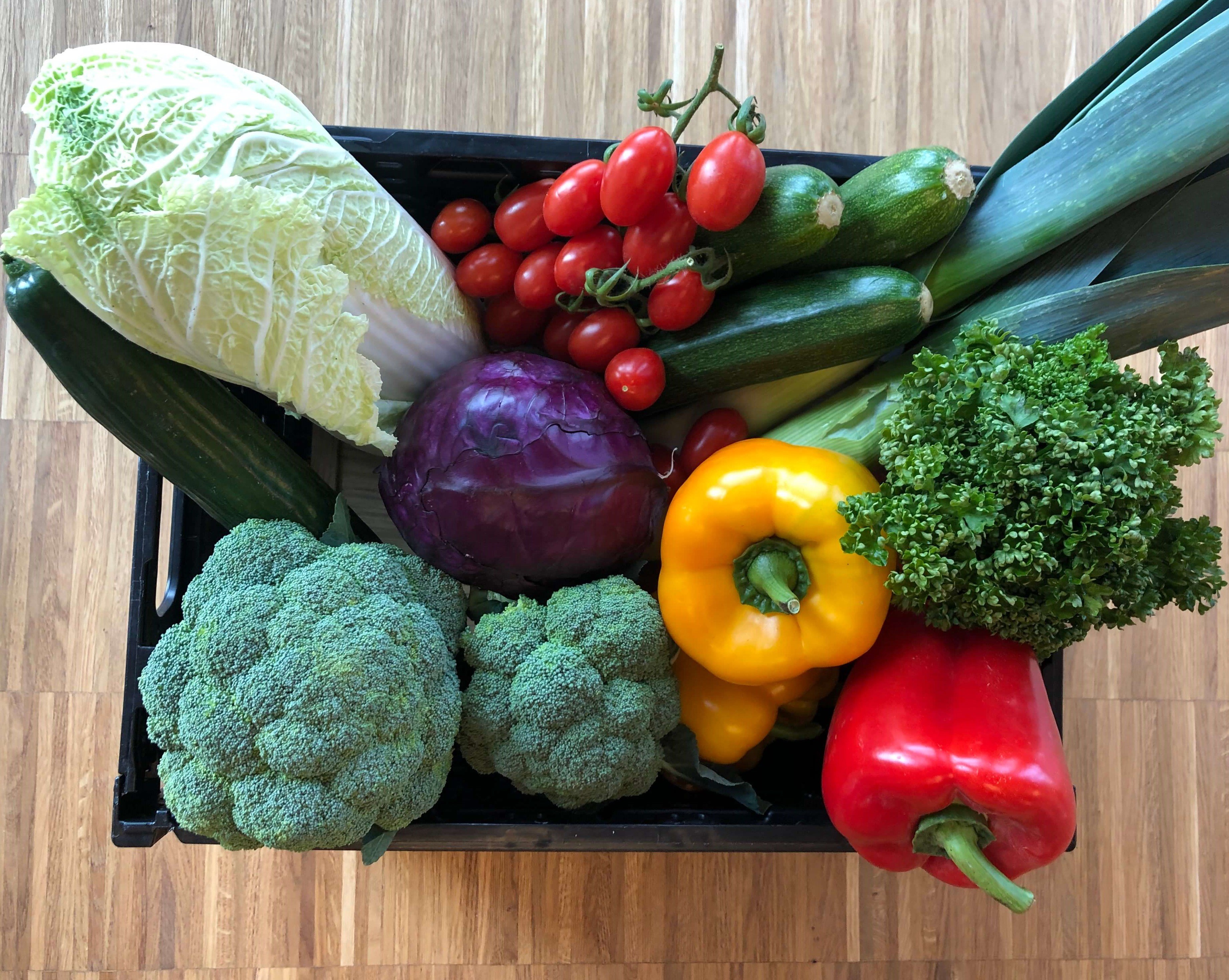 Wir liefern Ihnen wöchentlich wechselndes Gemüse der Saison. Der Gemüsekorb groß liefert Vitamine für eine drei bis vierköpfige Familie.  Ihre Frischekiste wird individuell gewogen und berechnet, deshalb kann es zu Abweichungen des gewünschten Bestellwerts von ein bis zwei Euro kommen.