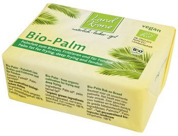 Landkrone Bio Palm besteht zu 100 % aus ungehärtetem Palmfett (aus Kern und Fruchtfleisch der Ölpalme). Es ist geschmacksneutral und eignet sich durch seine gute Hitzestabilität hervorragend zum Braten, Frittieren und für das Fondue.