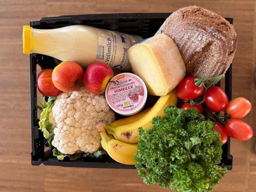 Diese Biokiste enthält ein Birkenhof Brot, Birkenhof Milchprodukte wie Trinkmilch, Joghurt oder Quark, ein Stück Käse sowie frisches saisonales Obst und Gemüse.