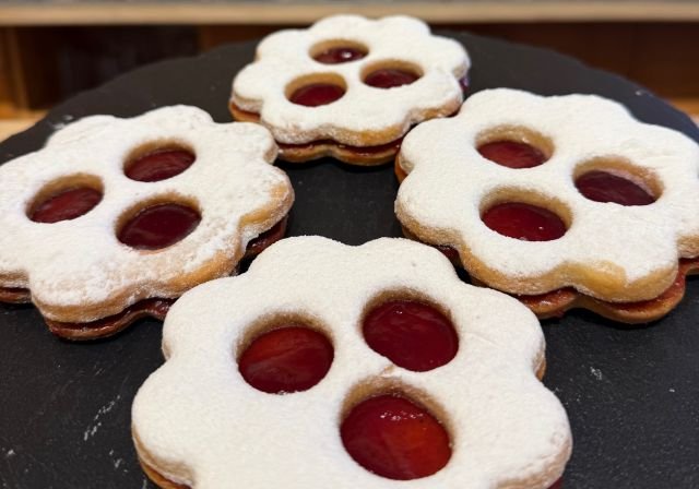 Weizenmehl**, Butter*, Ei**, Rohrohrzucker*, Himbeer Konfitüre* (Himbeeren* 68%, Rohrohrzucker*, Zitronensaft* 2%, Geliermitte: Pektine) Puderzucker*, Zitrone*, Salz, ,