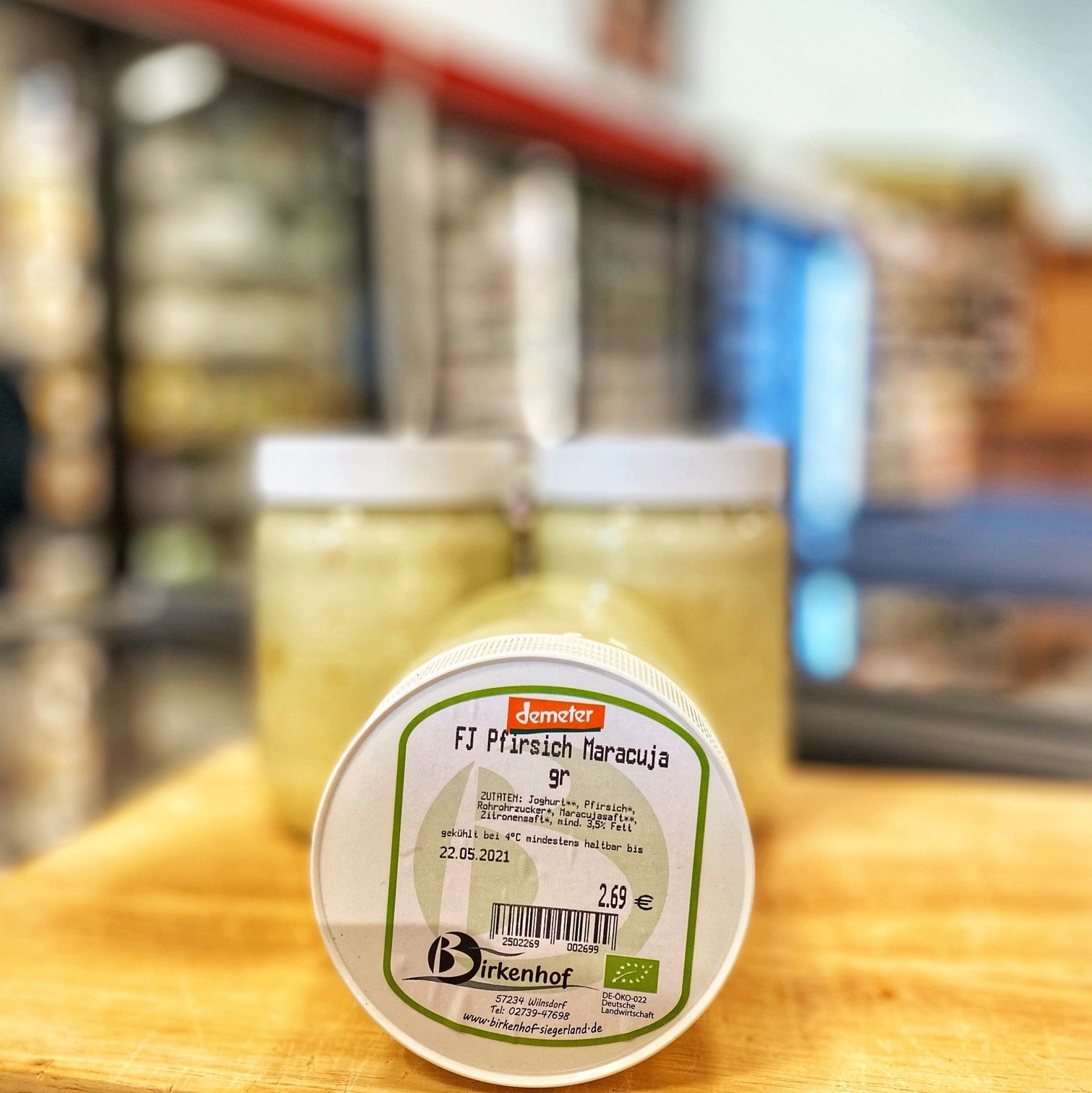 Joghurt**, 20% Fruchtzubereitung (24% Pfirsichstücke*, 25% Pfirsichmark*, 6% Maracujasaft*, 3% Rohrohrzucker*, Zitrnonsaft*, Zusatzstoffe: Verdickungsmittel: Johannesbrotkernmehl*)