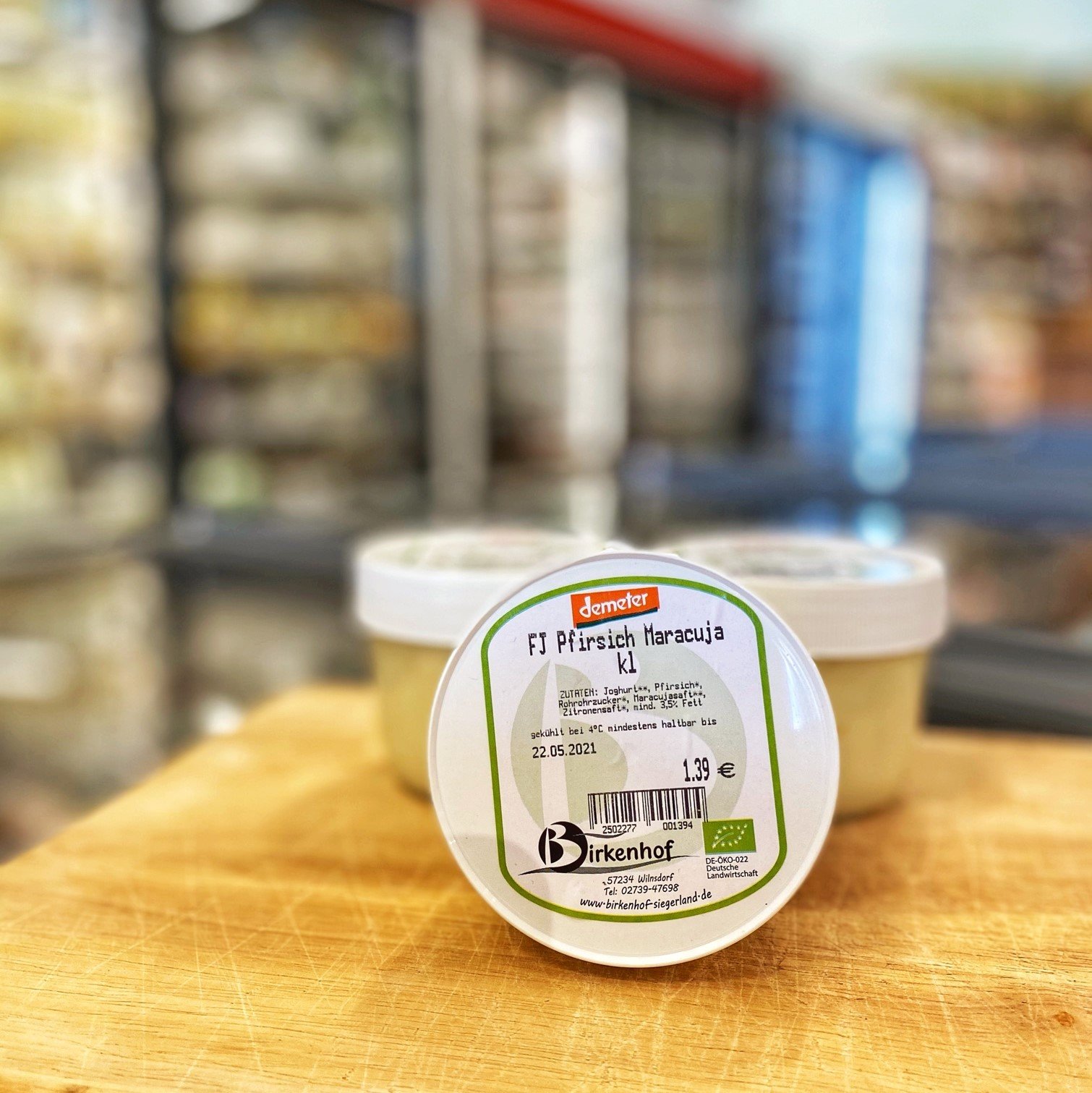 Joghurt**, 20% Fruchtzubereitung (24% Pfirsichstücke*, 25% Pfirsichmark*, 6% Maracujasaft*, 3% Rohrohrzucker*, Zitrnonsaft*, Zusatzstoffe: Verdickungsmittel: Johannesbrotkernmehl*)