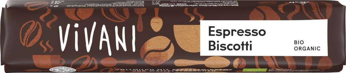 Bio Vollmilch Schokolade, gefüllt mit Espresso-Milchcrème und Waffelstückchen