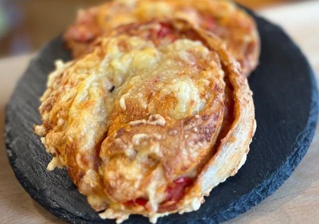 Weizenmehl**, Wasser, Hefe*, Tomaten Passata*, Strauchtomaten*, Paprika*, Gouda* (Kuhmilch*, Salz, tier. Lab), Pfeffer*, Salz, Pizzagewürz* (Oregano*, Tomate*, Sellerie*, Pastinake*, Zwiebel*, Basilikum*, Petersilie*, Lauch*, Spinat*, kann Spuren von Senf enthalten) Zwiebel*, Knoblauch*, Olivenöl*