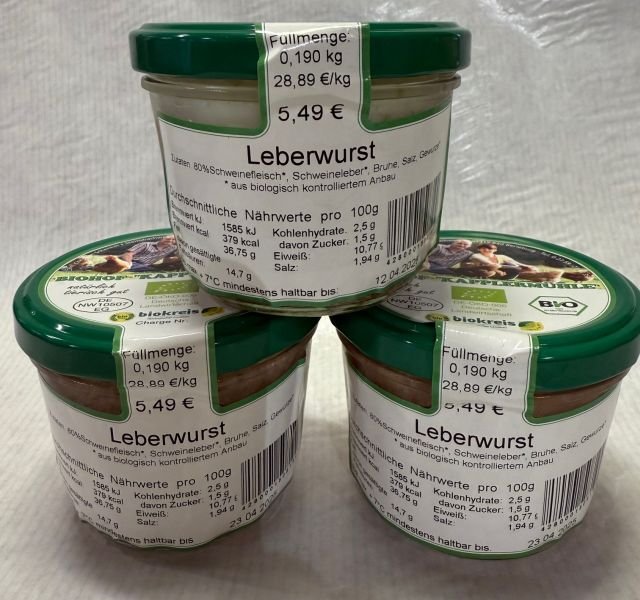 Schweinefleisch* 80%, Schweineleber*, Brühe,Salz, Gewürze*,