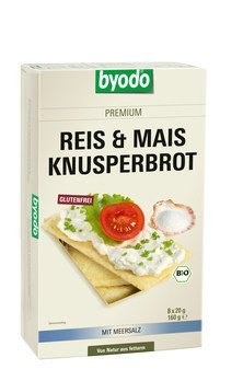 Das Byodo Reis & Mais Knusperbrot ist in praktische Monoportionen aufgeteilt. Die glutenfreien, knusprigen Scheiben sind mit etwas Salz gewürzt.