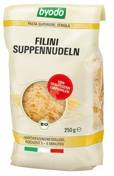 Die Filini, semola von Byodo werden aus feinstem italienischen Bio-Hartweizengrieß hergestellt. Die zarten Suppennudeln kochen in der Suppe gar.