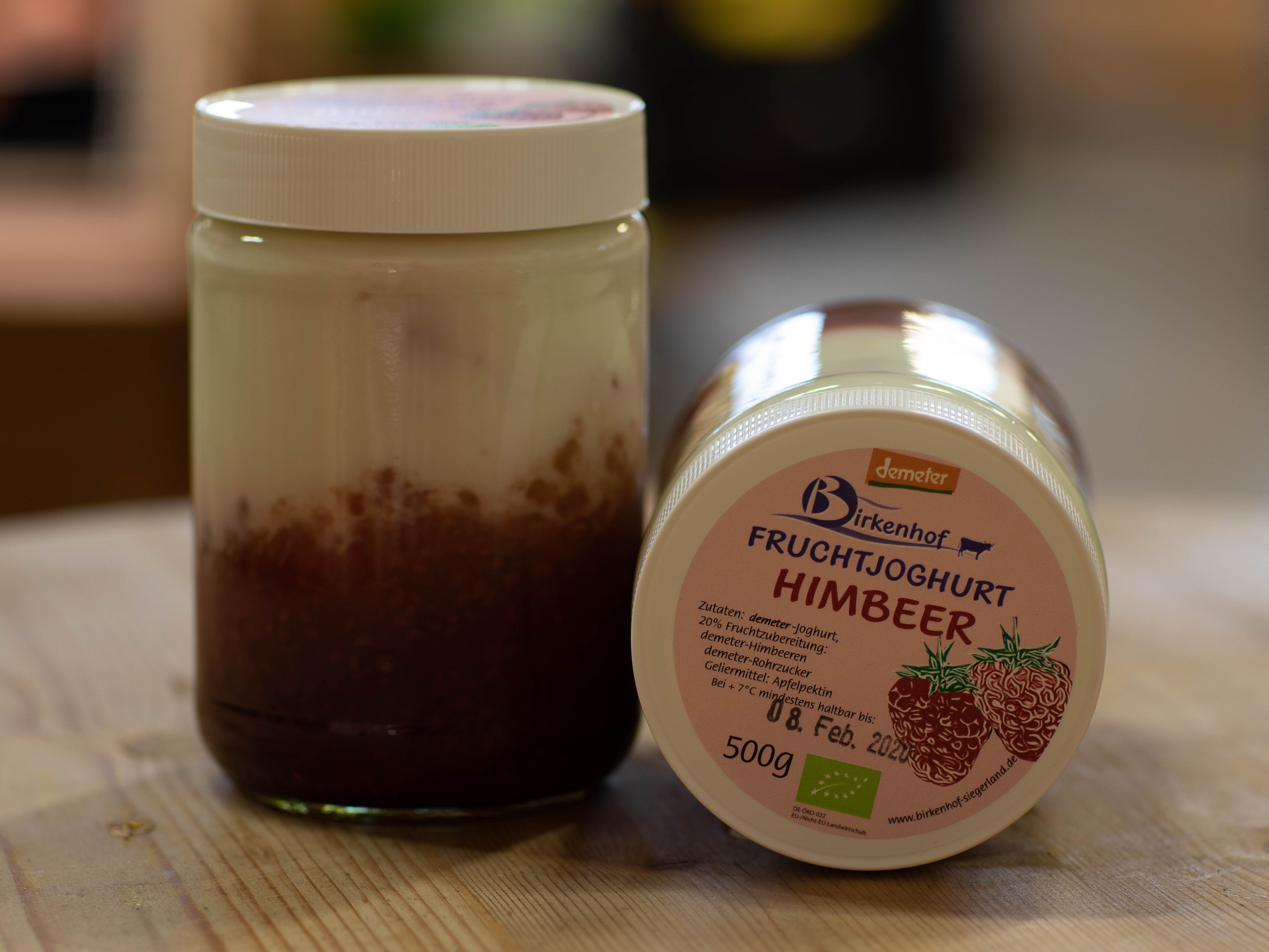 Joghurt**, 20% Fruchtzubereitung (38% Himbeeren*, 43,3% Rohrohrzucker*, Wasser, Schwarzer Johannisbeersaft*, Zitrnonsaft*, Zusatzstoffe: Verdickungsmittel: Johannesbrotkernmehl*)