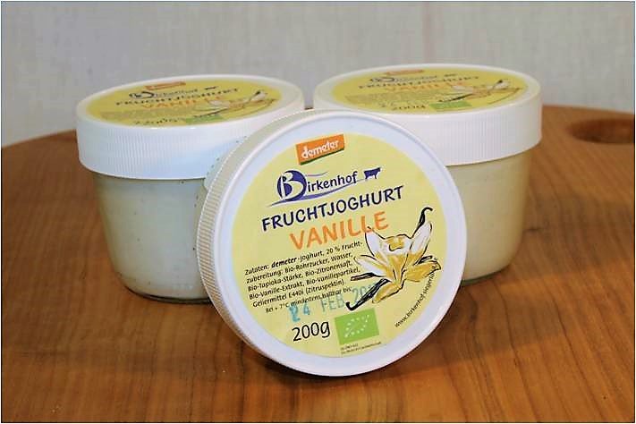 Joghurt**, 20% Fruchtzubereitung (52% Rübenzucker*, 46% Wasser, Zitrnonsaft*, Zusatzstoffe: Verdickungsmittel: Johannesbrotkernmehl*, Vanilleextrakt*, gem. Vanilleschote*)